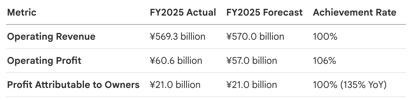 AEON Financial exceeded its revised operating profit forecast, achieving a 106% realization rate despite significant headwinds. The result was notably tempered by the absence of ¥9.9 billion in securitization gains that had bolstered the prior year’s results. The transfer of AEON Allianz Life Insurance resulted in a ¥9.7 billion revenue decrease; however, this was mitigated by a ¥12.3 billion reduction in related expenses, providing a net positive impact on the cost-to-income ratio. Profit attributable to owners reached ¥21.0 billion, a 135% surge compared to the ¥15.5 billion recorded in FY2024, largely due to the reduction of one-time extraordinary expenses.