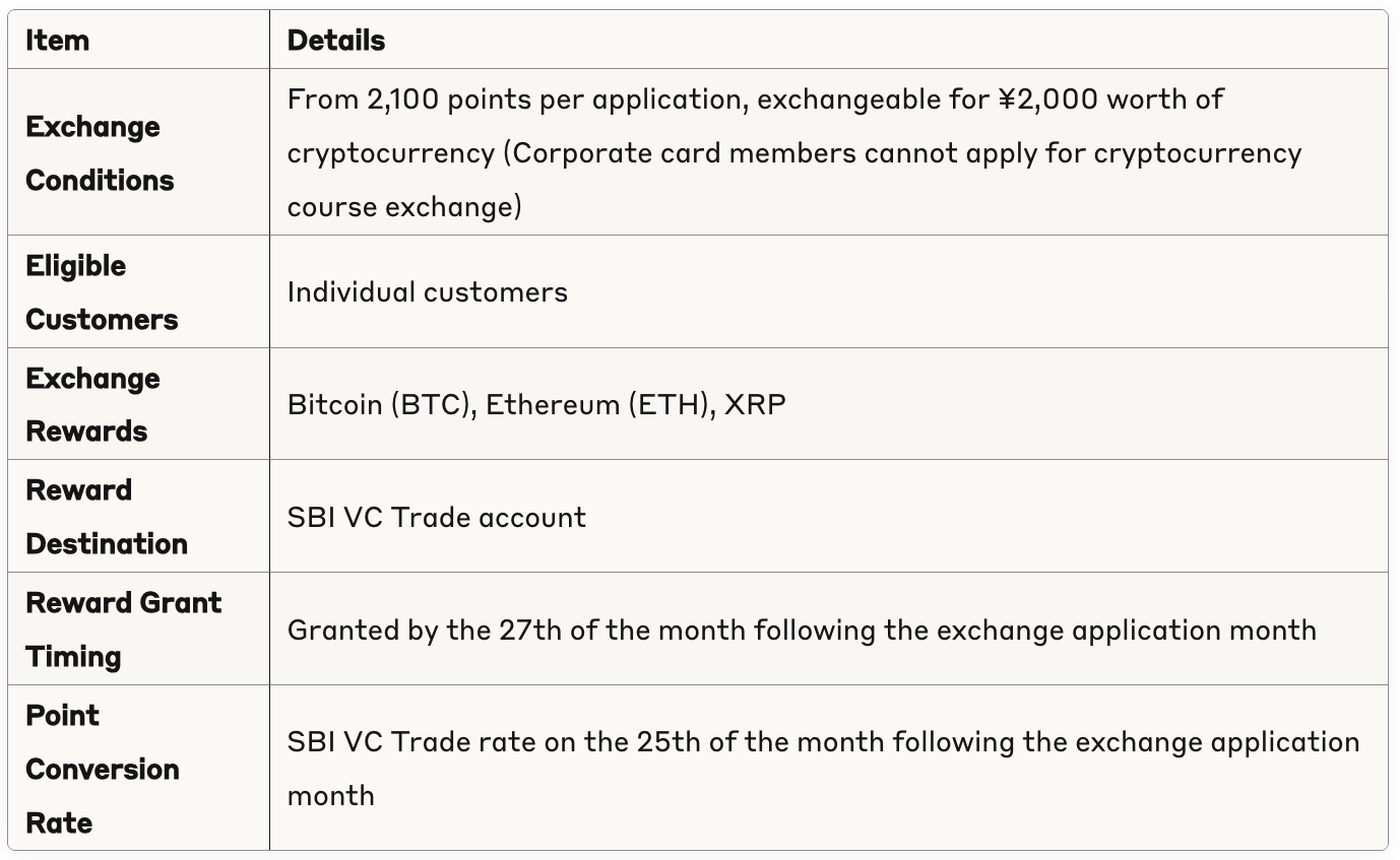 Aplus, a member of the SBI Shinsei Bank Group, and SBI VC Trade, a consolidated subsidiary of SBI Holdings engaged in the cryptocurrency exchange business, have collaborated to add Bitcoin (BTC), Ethereum (ETH), and XRP handled by SBI VC Trade as exchange rewards for the point service (Aplus Points) of credit cards issued by Aplus. This marks the first time cryptocurrency has appeared as an Aplus Point exchange reward.