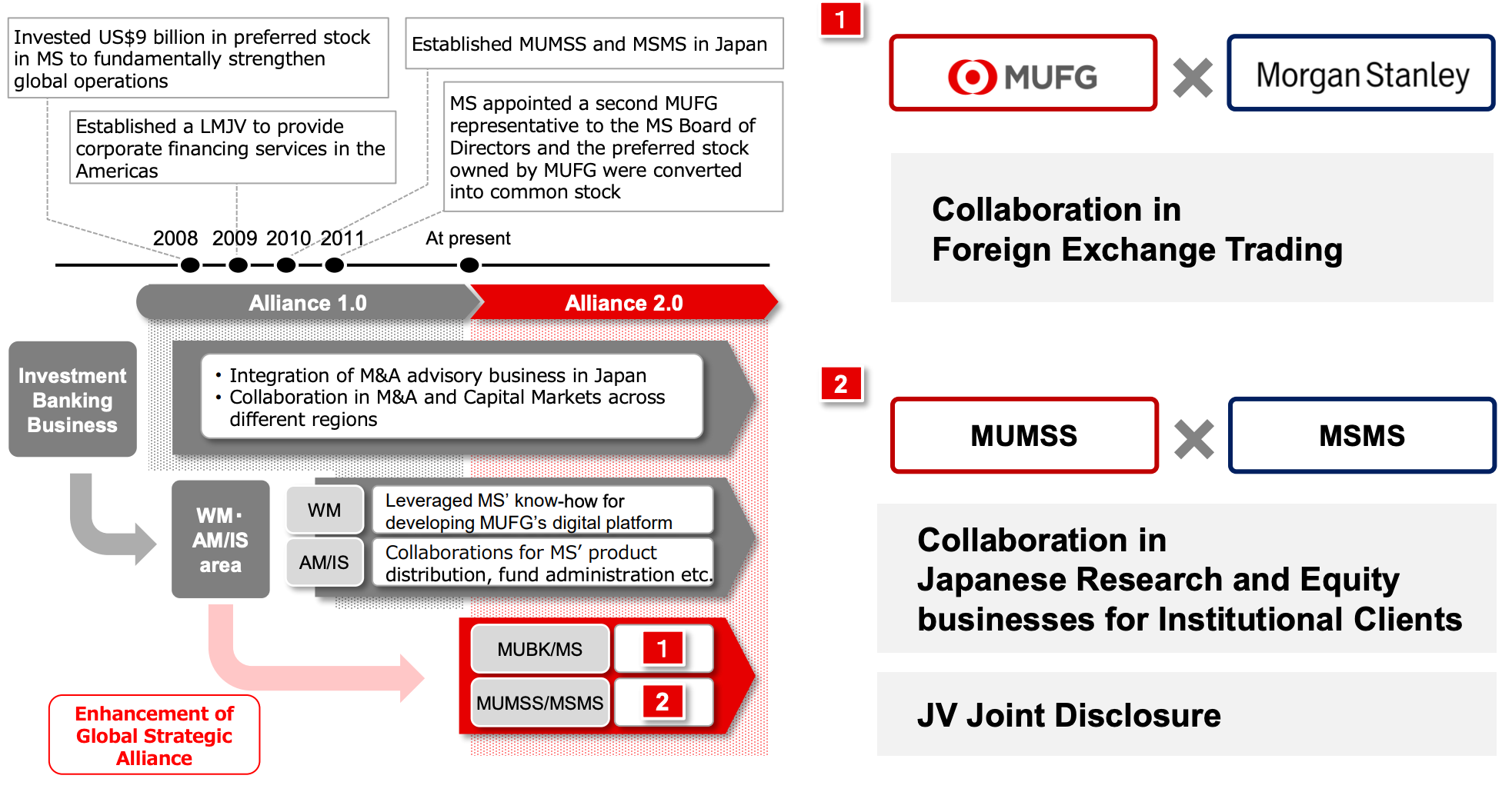 MUFG and Morgan Stanley announced Alliance 2.0, an enhanced Global Strategic Alliance for further collaboration between both firms for the next decade and beyond, in July 2023. The cornerstone of Alliance 2.0 is enhanced collaboration across critical client-facing businesses. In this spirit, MUFG and Morgan Stanley aim to leverage each other’s strengths to provide clients with the unique value our alliance offers and to meet their increasingly sophisticated and diverse needs.
