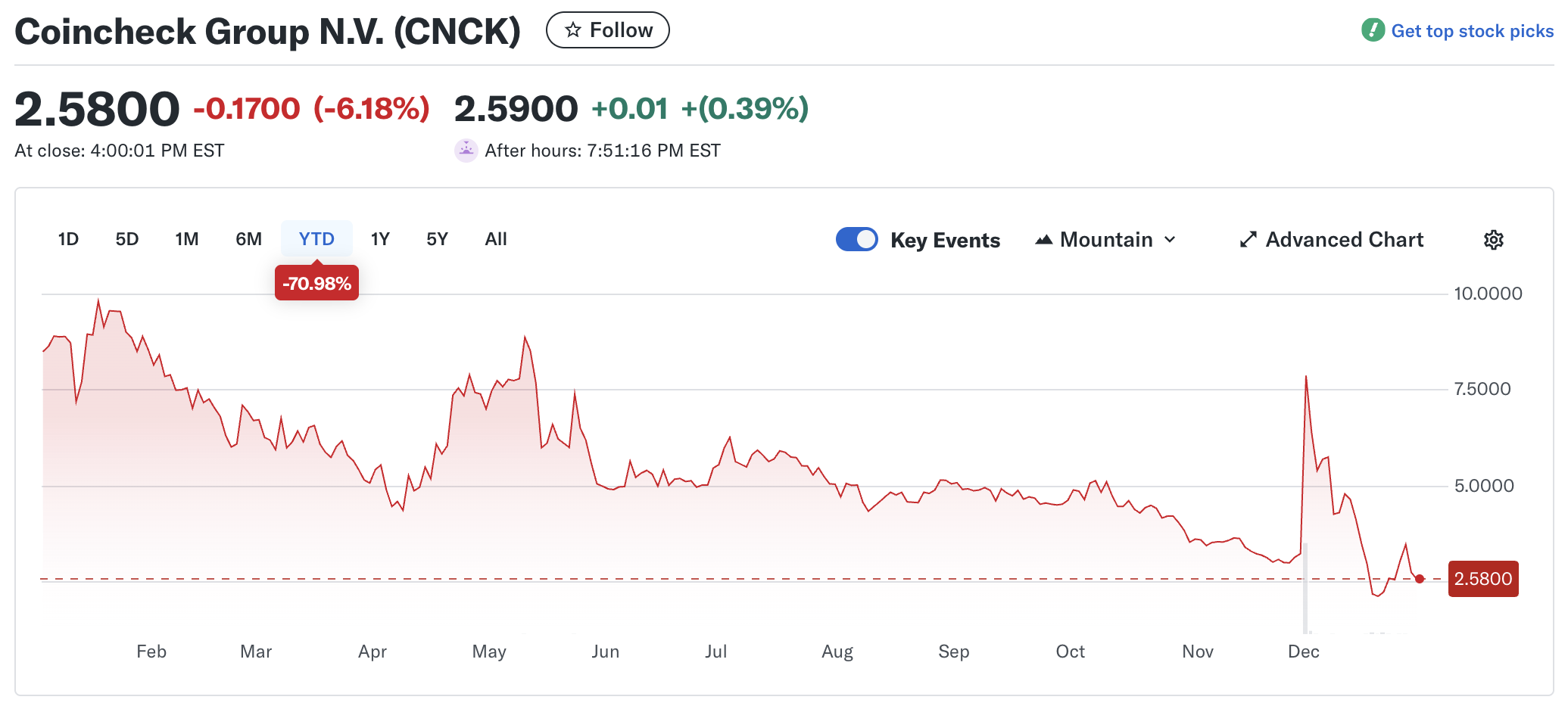 The request for a stock chart for the entirety of 2025 reveals a year of significant value erosion for Coincheck shareholders. While a visual chart cannot be generated here, the following analysis reconstructs the price action with high-fidelity data points derived from the trading year, effectively serving as a textual stock chart.
