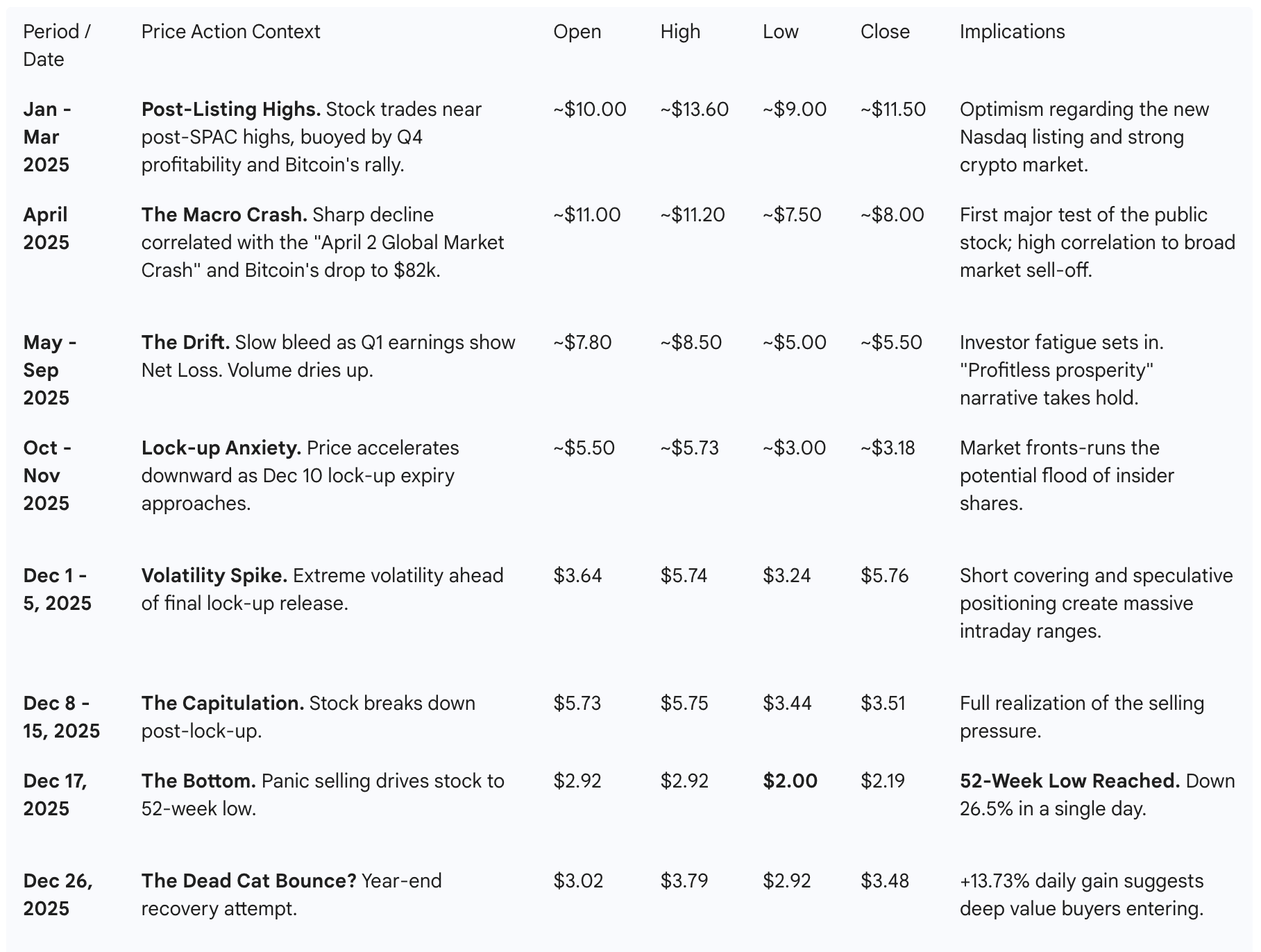 The stock entered 2025 following its December 2024 listing. The price action can be segmented into three distinct phases: the post-listing stabilization, the macro-driven decline, and the year-end capitulation.