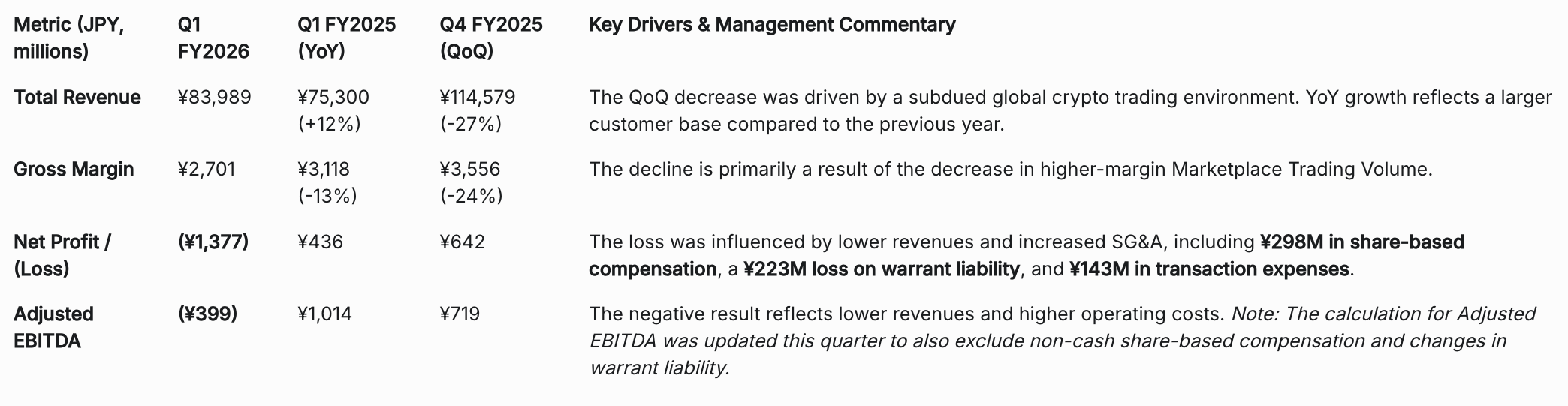 Coincheck Group reported a mixed first quarter for fiscal year 2026, characterized by a challenging crypto market that impacted trading revenues, but underscored by significant strategic progress and strong underlying growth in its user base and assets.