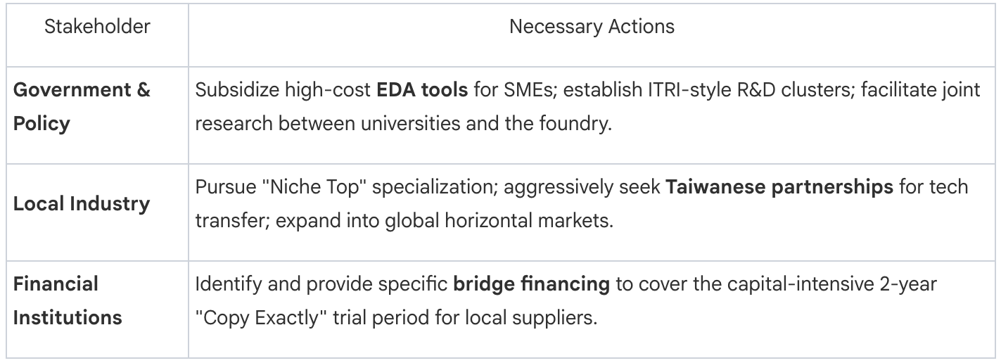 Maximizing regional economic value capture requires bridging the structural gap between the "Copy Exactly" global procurement standards and the capabilities of local suppliers, while simultaneously fostering a local ecosystem for semiconductor design and end-use application.