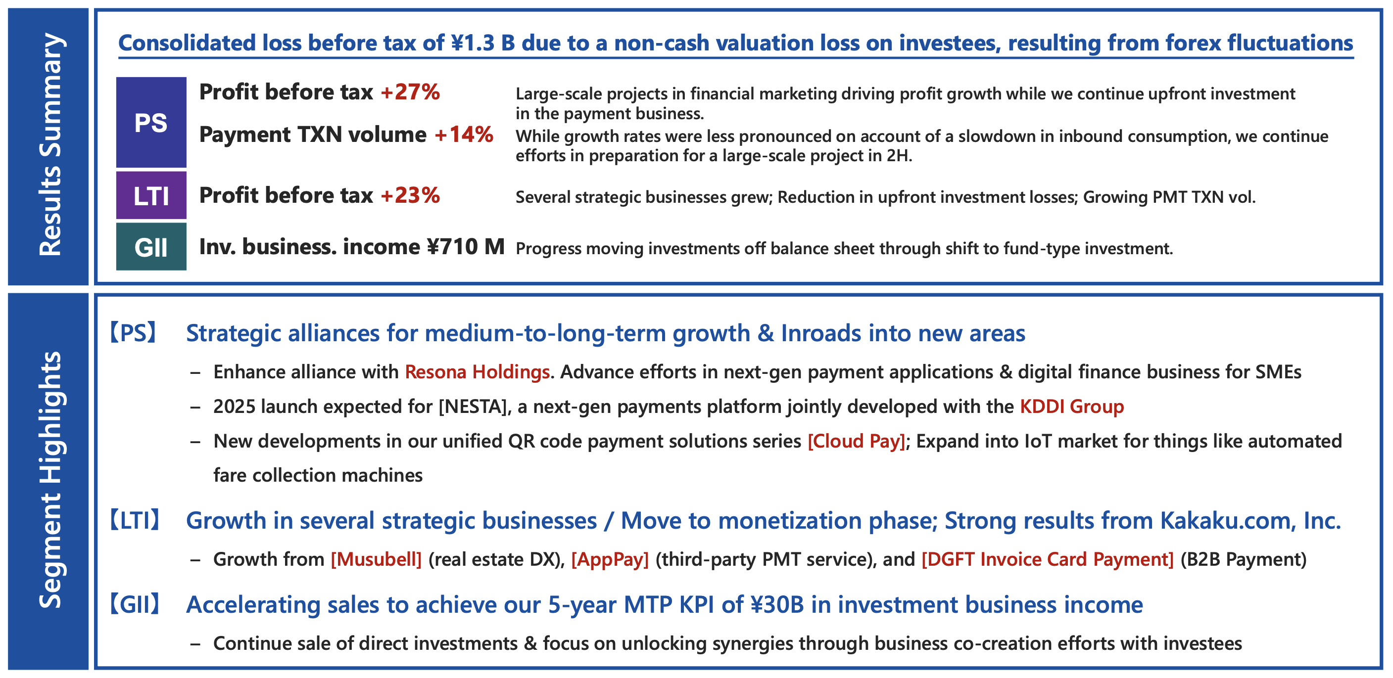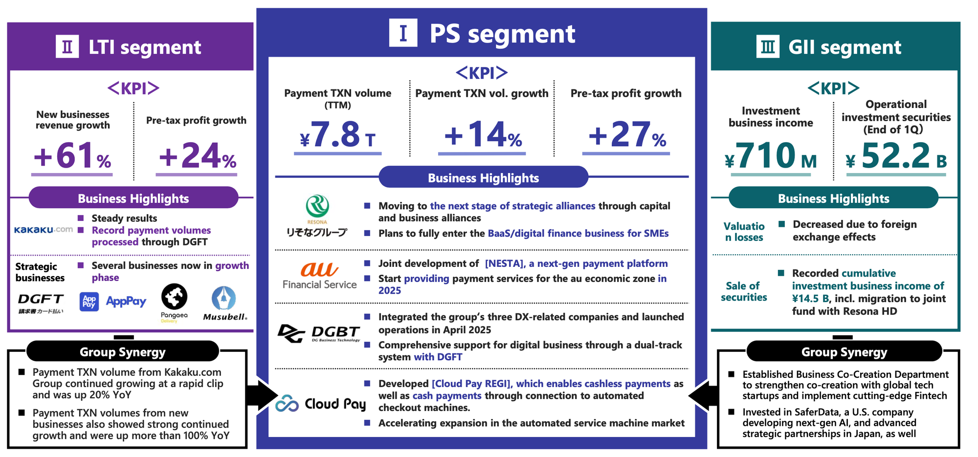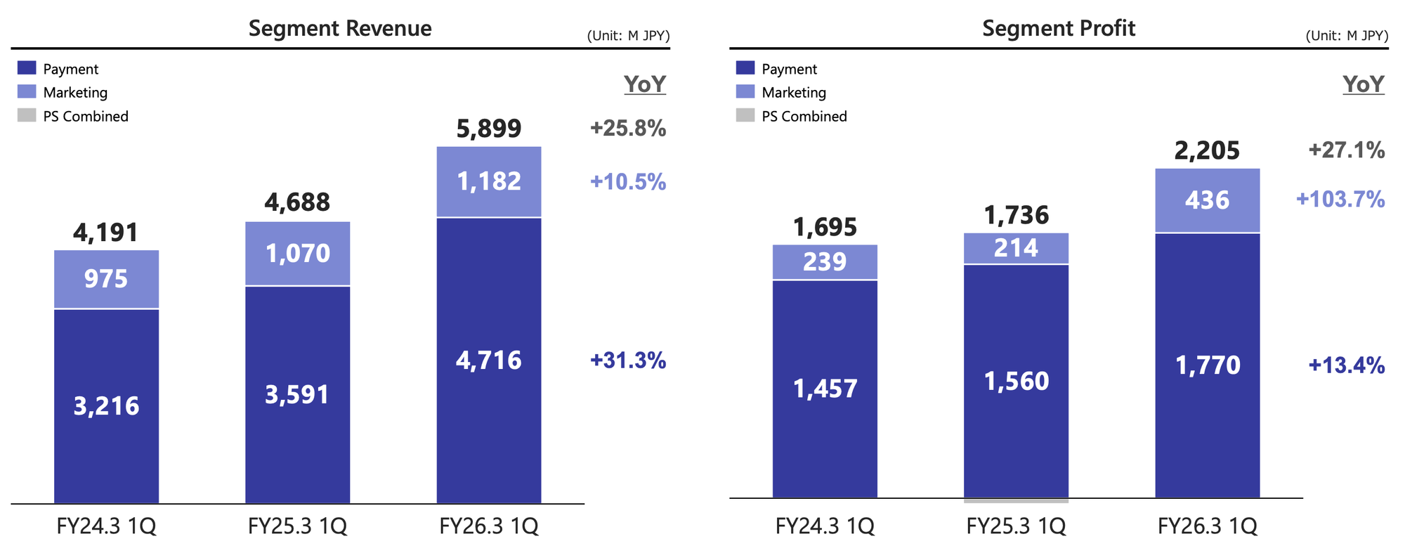 Payment Sub-Segment: The foundational payment business continued its steady growth, with PBT increasing 13.4% YoY to ¥1,770 million. Total payment transaction volume (TXN) grew 14.0% YoY to reach ¥2,040 billion for the quarter. While solid, this represents a moderation in the growth rate. The company attributes this to specific, identifiable headwinds: a plateau in high-ticket inbound tourist spending at department stores due to the yen's appreciation, and difficult year-over-year comparisons in the securities category following a surge in transactions related to Japan's new NISA investment program in the prior year. The company anticipates growth will re-accelerate in the second half of the fiscal year as large-scale projects, such as the KDDI partnership, become operational.
