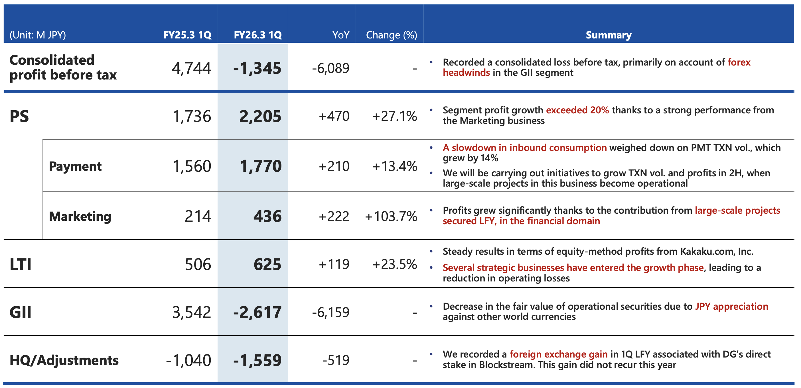 Digital Garage's (DG) first-quarter results for the fiscal year ending March 2026 present a stark dichotomy that requires careful dissection. The headline figure—a consolidated pre-tax loss of ¥1.3 billion—paints a misleading picture of the company's health, triggering a market sell-off. This loss was driven almost entirely by non-cash, non-operational foreign exchange headwinds within the Global Investment Incubation (GII) segment. Beneath this surface-level volatility lies a core operational engine that is not only healthy but demonstrating accelerating strength and profitability.