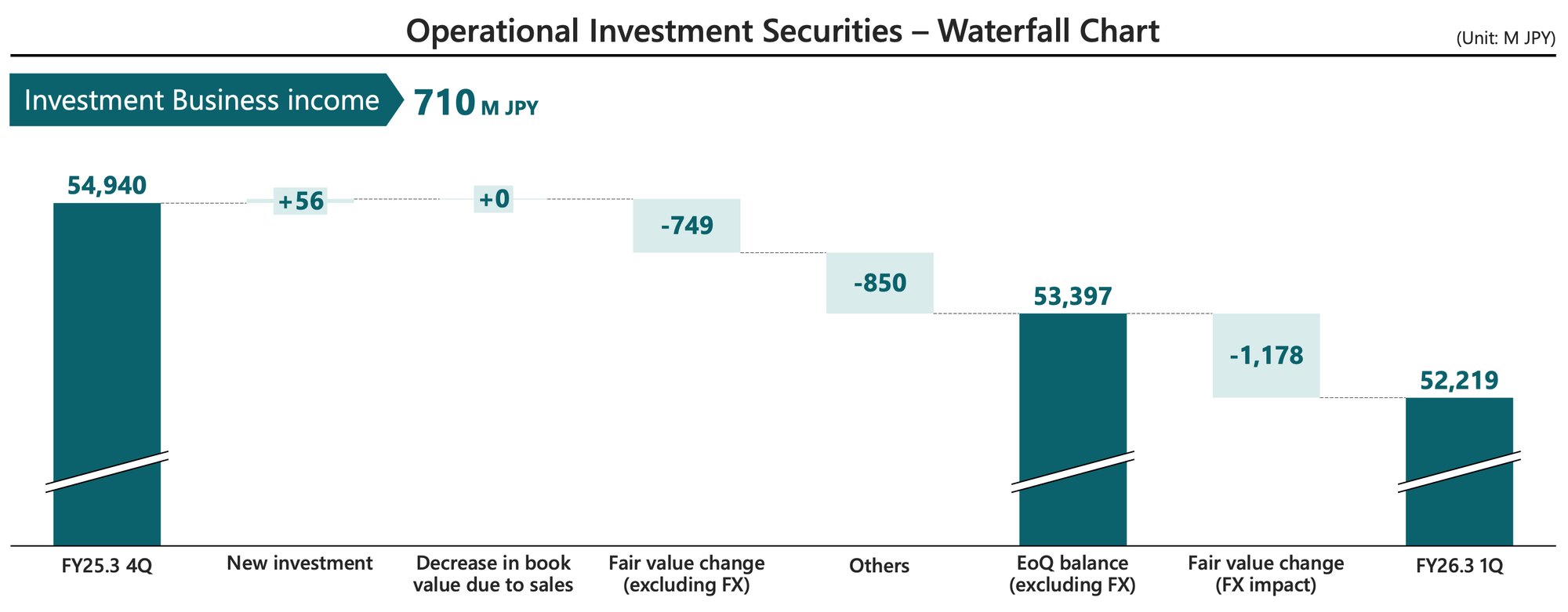 The cause of this loss is clearly delineated by the company and is non-operational in nature. A waterfall chart reconciling the change in the value of operational investment securities shows that a -¥1,178 million "Fair value change (FX impact)" was a primary driver of the decline. This is a non-cash accounting adjustment resulting from the appreciation of the Japanese Yen against the US Dollar and other currencies. With 47.1% of the portfolio's value in North America and 80.2% of its investments denominated in USD, the GII segment is highly exposed to such currency fluctuations. An additional factor was the non-recurrence of a large foreign exchange gain related to a stake in Blockstream that was recorded in 1Q FY25.3.