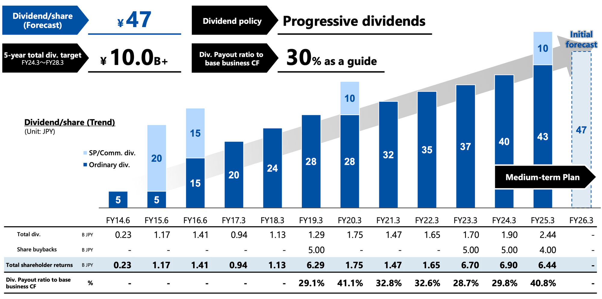 - Progressive Dividend: The company is committed to steadily increasing its dividend. The forecast for FY26.3 is a dividend of ¥47 per share, representing a 9.3% increase from the ¥43 per share paid for FY25.3. This demonstrates management's confidence in the earnings power of the core business. The target payout ratio against base business cash flow is 30% or more.