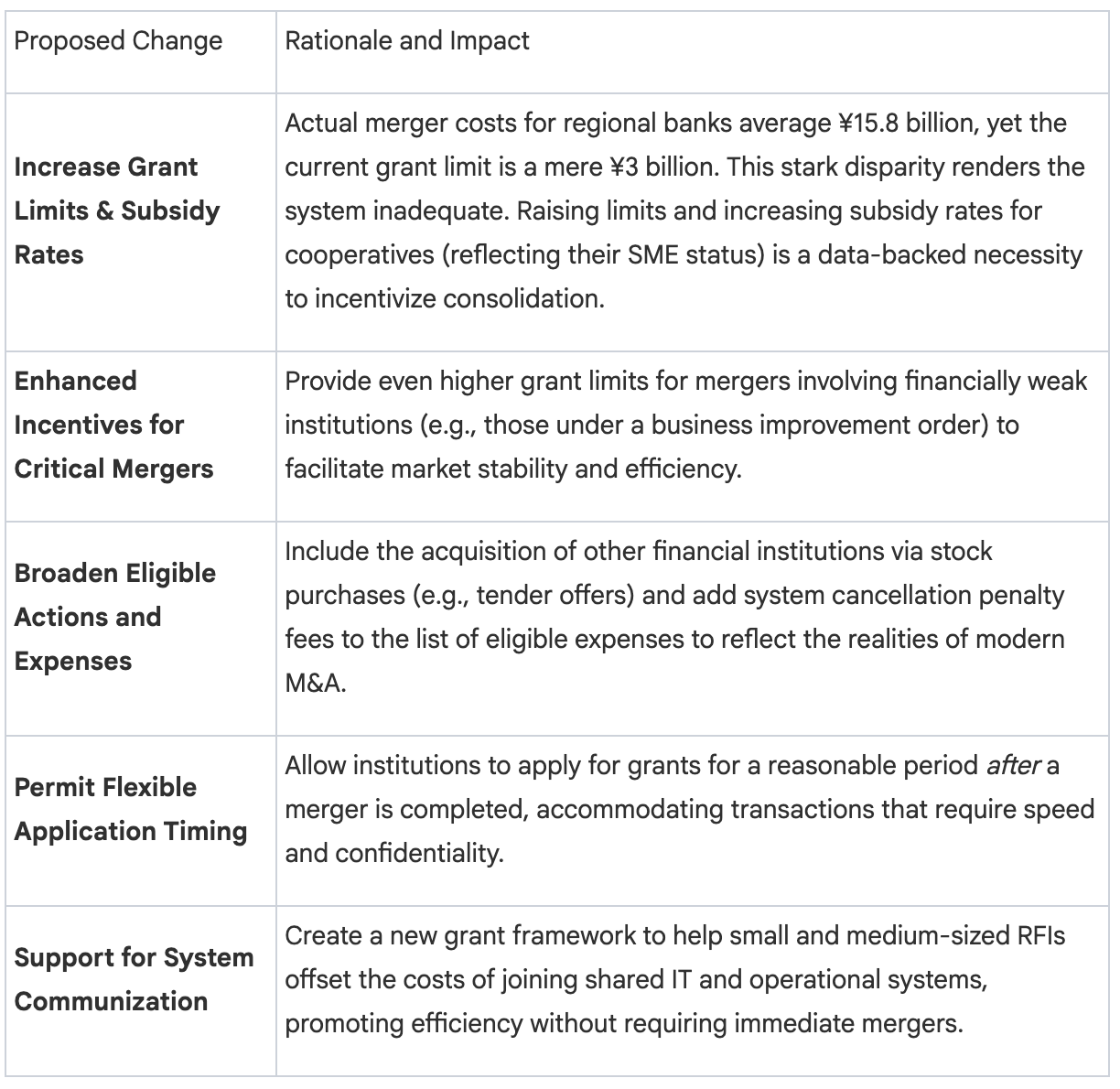 The grant system, which supports costs associated with mergers and business restructuring, is another critical tool that requires modernization. Its application deadline should be extended beyond March 2026 to align with related long-term policies, such as the special provisions in the Antimonopoly Act that expire in November 2030. This provides a stable and predictable runway for institutions contemplating necessary consolidation.