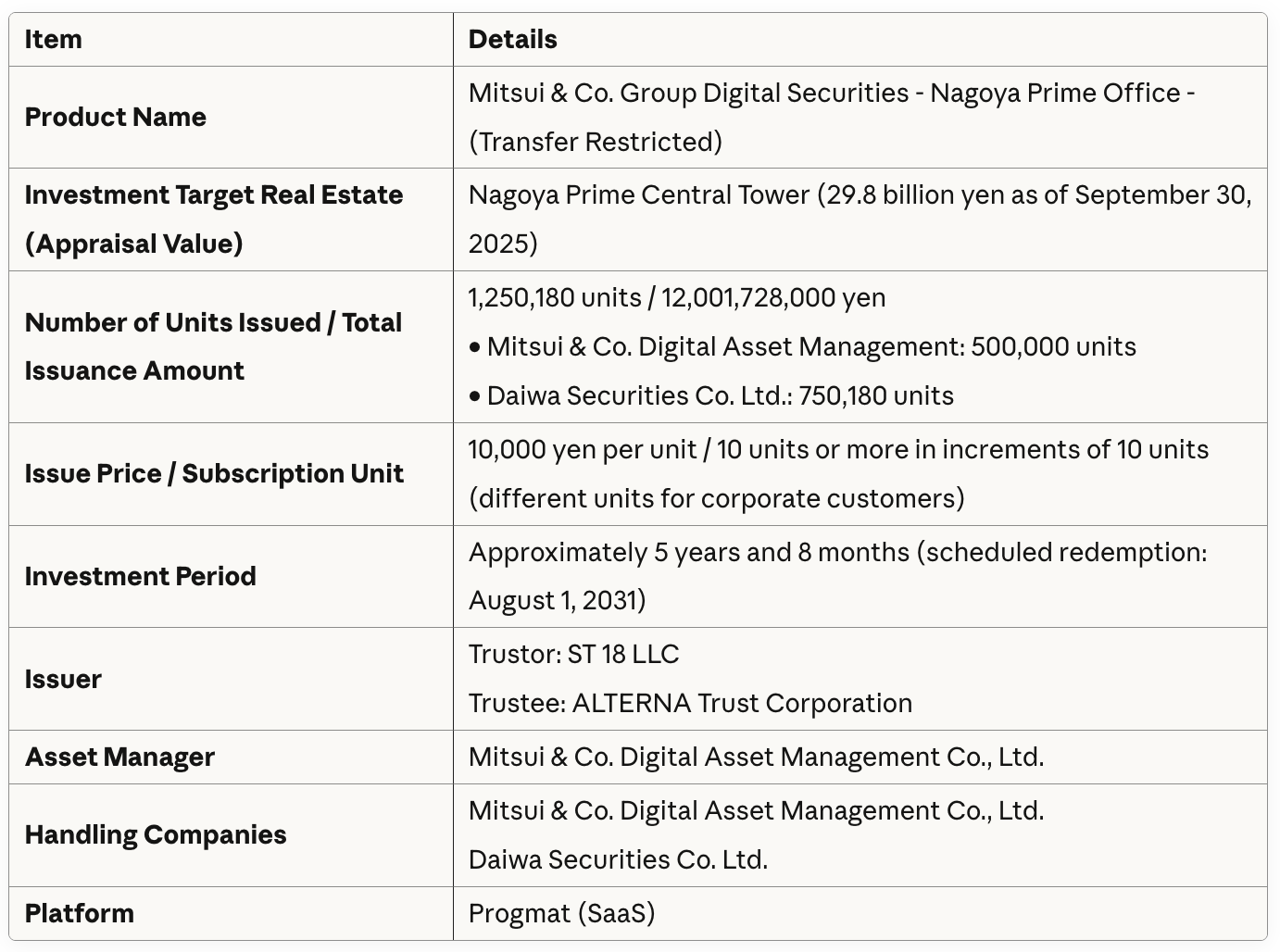 ALTERNA Trust, Mitsui & Co. Digital Asset Management, Daiwa Securities, and Progmat have completed the fundraising and issuance for the security tokenization (ST) of "Mitsui & Co. Group Digital Securities - Nagoya Prime Office - (Transfer Restricted)".