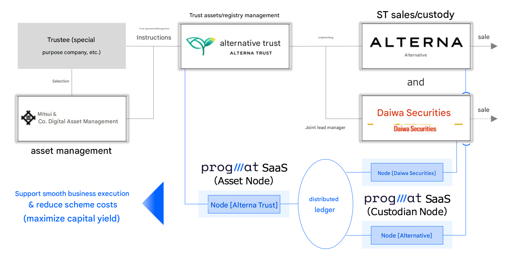 Progmat provides "Progmat SaaS" to ALTERNA Trust, MDM, and Daiwa Securities, supporting smooth business operations. "Progmat SaaS" is a product that enables a wide range of financial institutions to easily start digital asset-related businesses (registry management, custody, etc.) without building blockchain/distributed ledger nodes on their own servers, and also enables a wide range of securities companies/intermediaries to complete private key management for investors in-house without delegating to third parties (custodians). By providing this product, it contributes to reducing scheme costs and maximizing yields returned to investors.