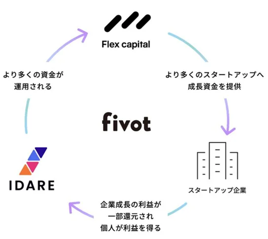 Fivot operates two businesses: "Flex Capital," a lending business for startups, and "IDARE," a cashless app with savings features for individuals. Through the construction of a capital circulation ecosystem combining these two businesses, Fivot achieves both the supply of growth capital to startups and support for individual asset formation through the redistribution of returns.