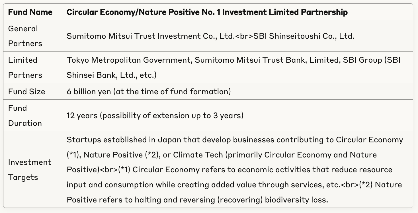 Sumitomo Mitsui Trust Bank has announced that its subsidiary, Sumitomo Mitsui Trust Investment, has formed the Circular Economy/Nature Positive No. 1 Investment Limited Partnership jointly with SBI Shinsei Corporate Investment, and commenced investment activities. Sumitomo Mitsui Trust Bank has also announced that it has made an LP investment in the Fund. The Fund will seek to raise LP investments from parties sympathetic to this initiative toward a target total operating amount of approximately 10 billion yen.