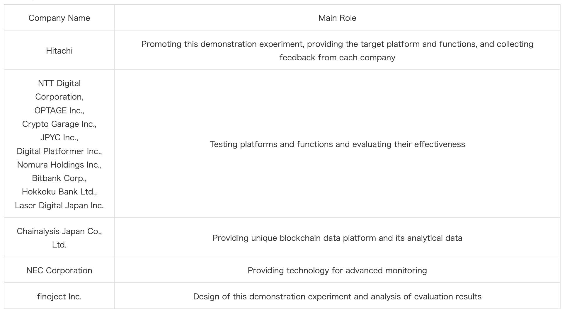 Hitachi, together with NTT Digital, OPTAGE, Crypto Garage, JPYC, Chainalysis Japan, Digital Platformer, NEC, Nomura, bitbank, finoject, Hokkoku Bank, and Laser Digital Japan, has begun a proof-of-concept experiment from February to April 2025 aimed at improving the effectiveness and standardization of anti-money laundering practices for digital asset trading including cryptocurrency, stablecoins, and NFTs.