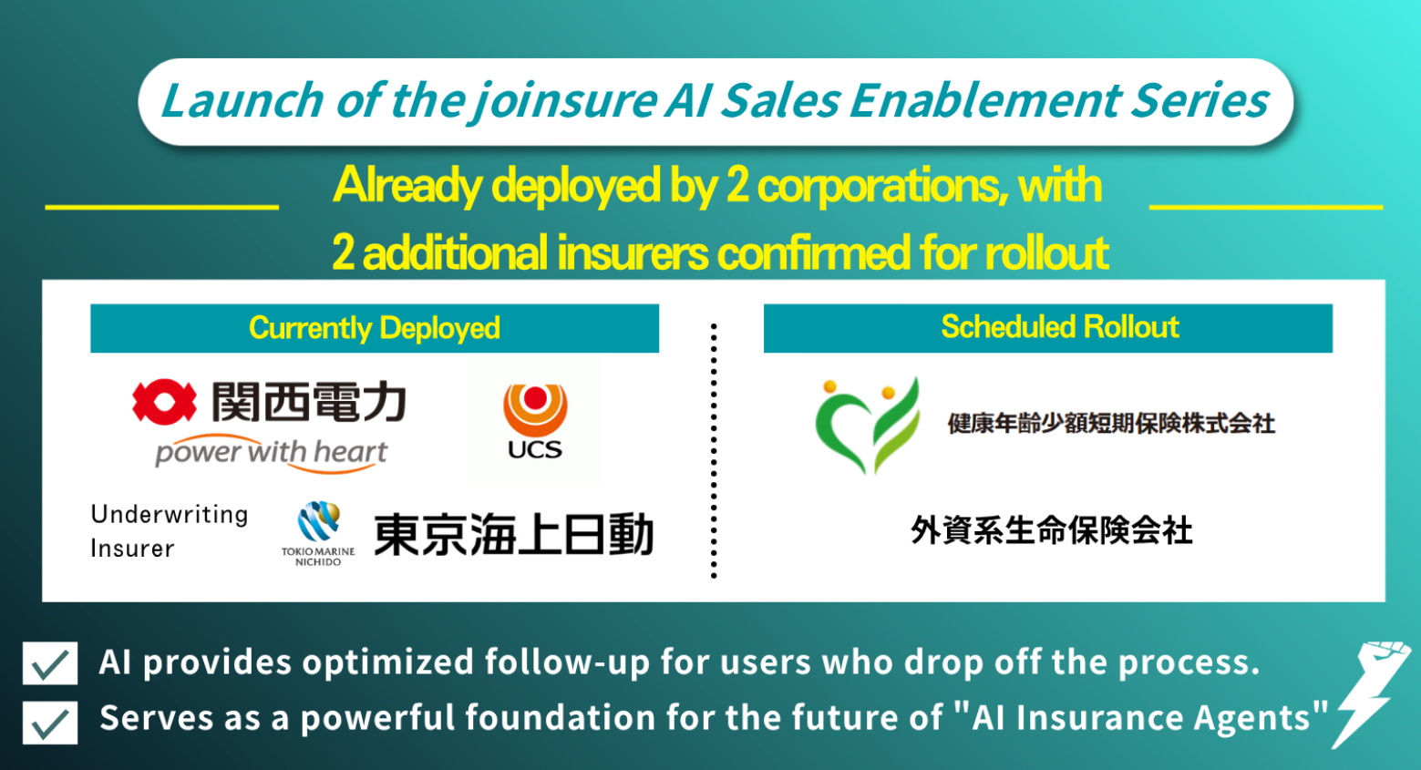Tokyo-based InsurTech pioneer justInCaseTechnologies has launched its "joinsure AI Insurance Sales Enablement Series." The new generative AI-powered suite is designed specifically to tackle the industry's most persistent challenge: high customer drop-off rates during the digital application process.