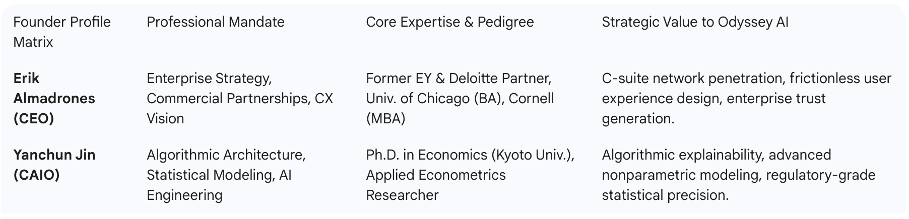 The strategic trajectory, product architecture, and ultimate enterprise credibility of an early-stage B2B enterprise software venture are overwhelmingly determined by the pedigree, network, and intellectual capabilities of its founding team. In the notoriously rigid, hierarchy-driven, and risk-averse environment of Japanese corporate finance and insurance, technological superiority alone is insufficient for market entry; extreme institutional trust is required. In the case of OdysseyAI, the leadership structure represents a highly calculated, exceptionally rare synthesis of elite global enterprise consulting and uncompromising academic data science. This dual-pillar leadership structure is the foundational asset of the firm.