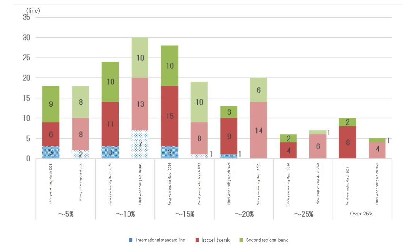 In the fiscal year ending March 2023, 12 banks had a materiality test ratio that exceeded the 20% threshold for domestic standard banks. The number of banks with a ratio of over 25% increased to 10 during the fiscal year ending March 2024, doubling from five in the previous fiscal year.