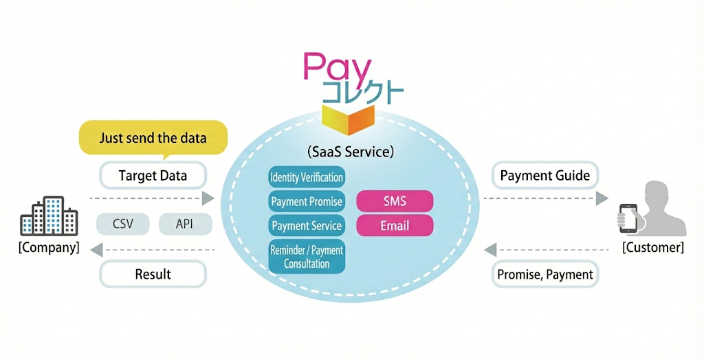 The "Pay Collect" system manages the lifecycle of the collection process, from importing target data (via CSV or API) to sending notifications (SMS/Email) and recording results. With the new integration: