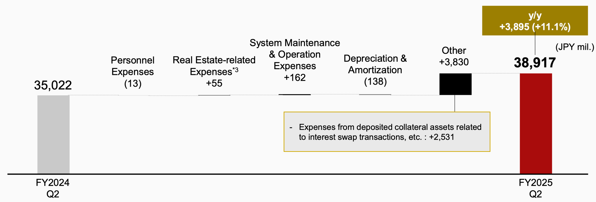 - Other Operating Expenses (+96.4% YoY to JPY 7,801 mil.): This category increased sharply, predominantly due to the amount returned to clearing participants for deposited collateral assets related to interest swap transactions (JPY 2,531 million). This expense is the corresponding outflow related to the substantial revenue gain in Clearing Services. The increase was also impacted by a decrease in "software carryover" following the launch of new systems like arrowhead 4.0.