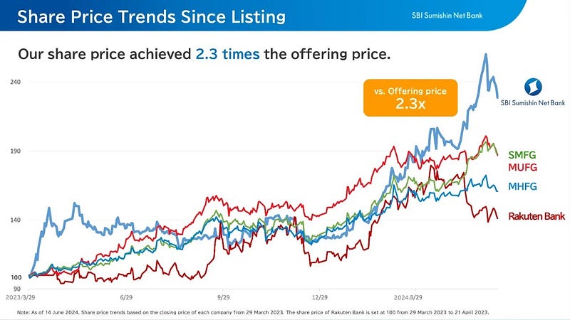 - Japan’s Banking Act does not have a requirement to maintain physical branches, so pure-bred digital banks have a long history in this country; above graph compares the share price performance of two examples of banks that IPO’ed last year, namely SBI Sumishin Net Bank and Rakuten Bank, with the mega banks