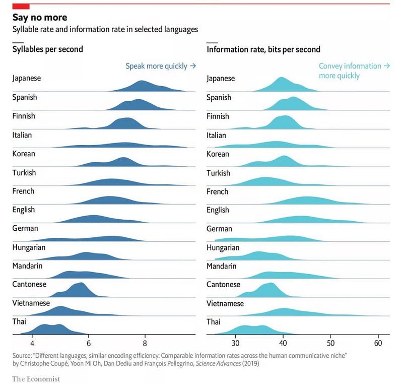 The Economist published the above graph, contrasting the speed of speaking with the speed of information transmission. If you ever wondered why I cannot get a word in when talking to my Japanese wife, now you have the answer.
