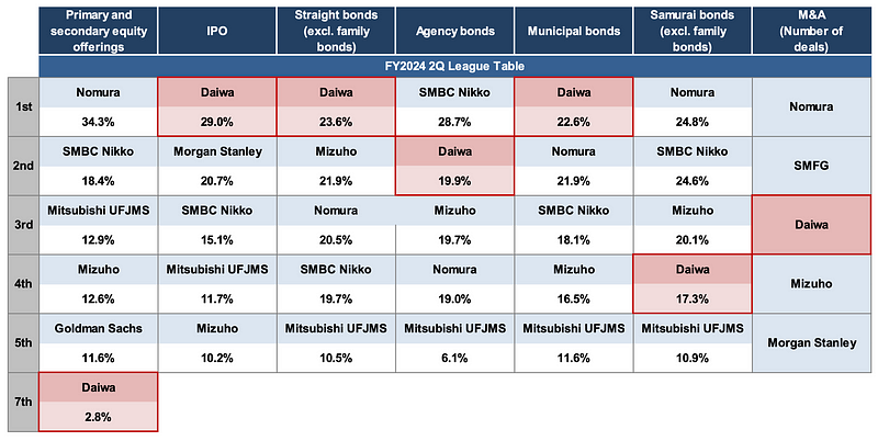 - Daiwa Securities, MUFG Securities, and Nomura all reported strong second quarter earnings; Daiwa’s results presentation helpfully included above league tables for the first half of the current Japanese fiscal year (April to September)