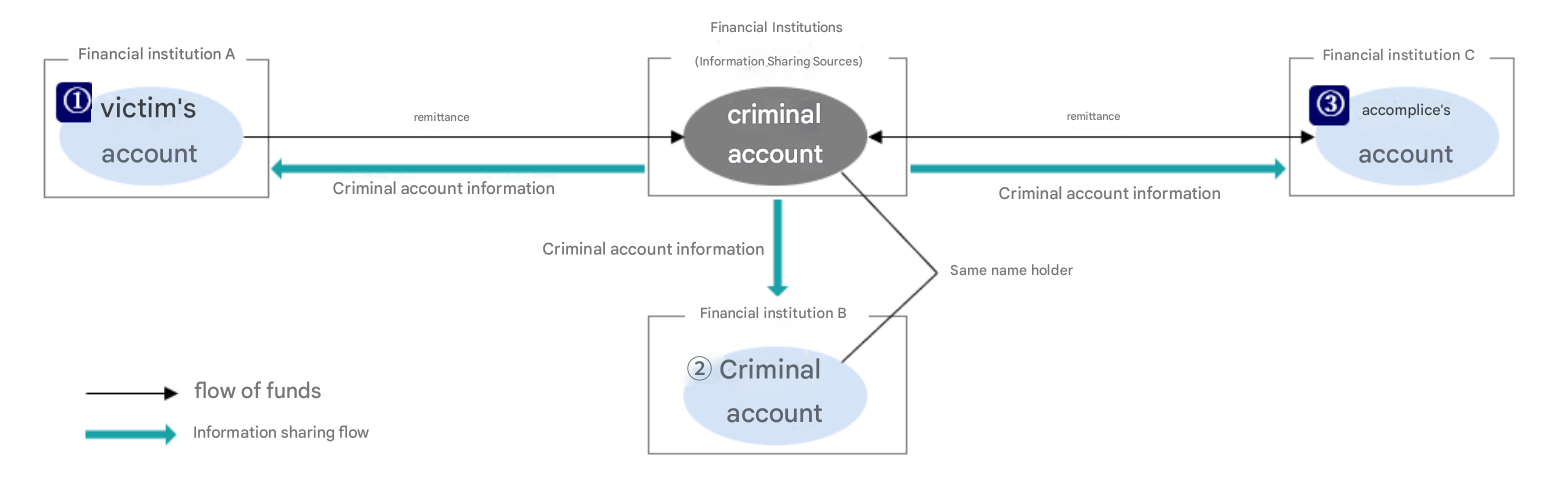 Therefore, it is necessary to build a framework for the entire financial industry to share information about criminal accounts. By utilizing the shared information, each financial institution will be able to detect: