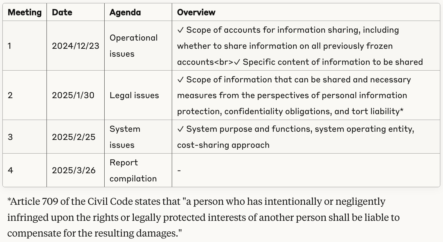 To establish this framework, in December 2024, the Japanese Bankers Association established the "Study Group on Information Sharing of Fraudulently Used Accounts" to discuss issues related to operations, legal requirements, and systems.