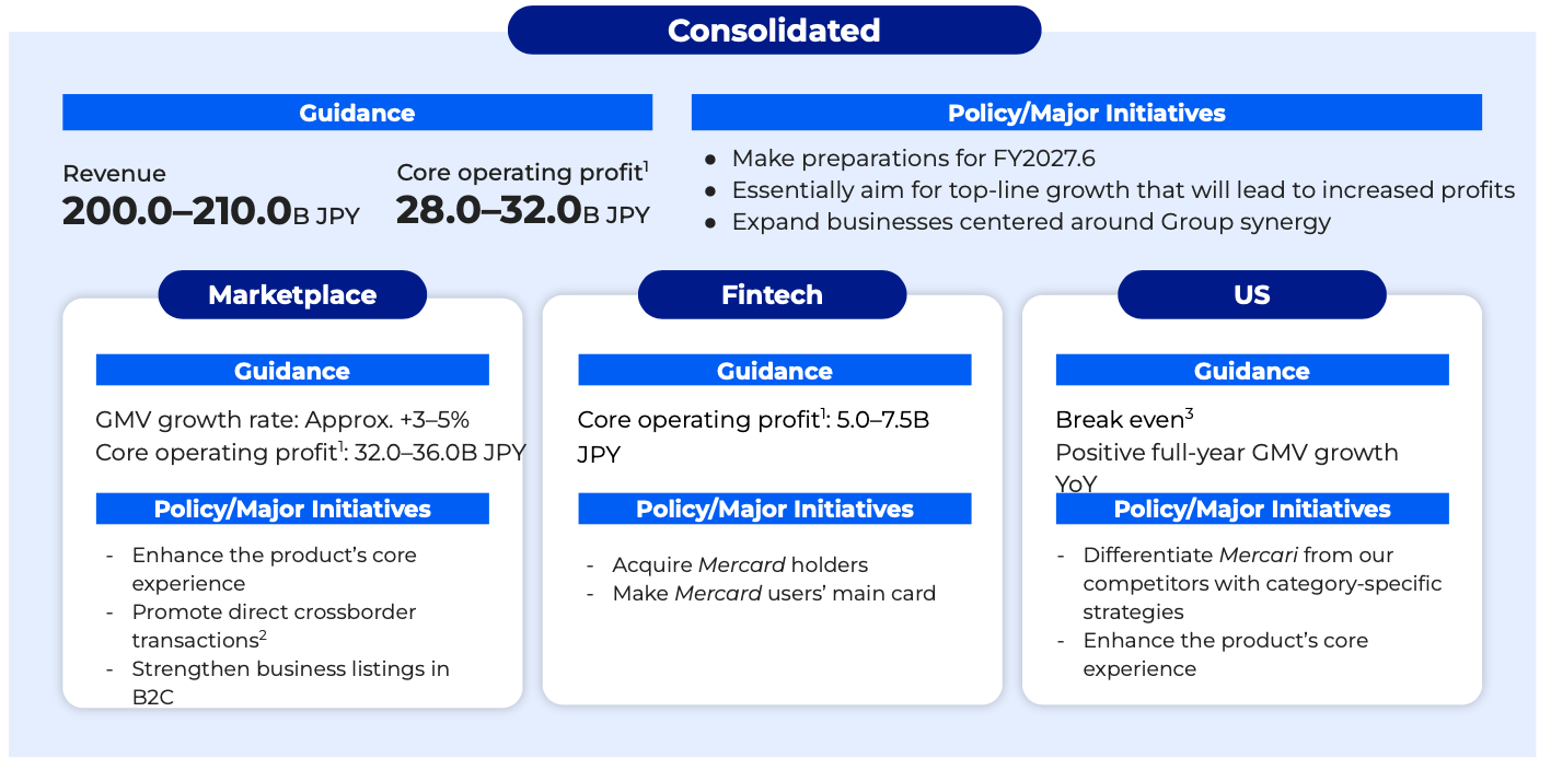 Mercari recorded a favorable start to the fiscal year in all three of Mercari Group's major businesses, with the recovery of the Marketplace GMV growth rate, the achievement of positive GMV growth in its US business, and the growth of FinTech credit services. Consolidated revenue was 49.4B JPY (+10% YoY) and consolidated core operating profit was 9.3B (+128% YoY). Going forward, Mercari aims to continue promoting product innovation by leveraging AI, and from Q2 onward, they aim to achieve their full-year financial forecast while strengthening the investment needed for growth in FY2027.6.