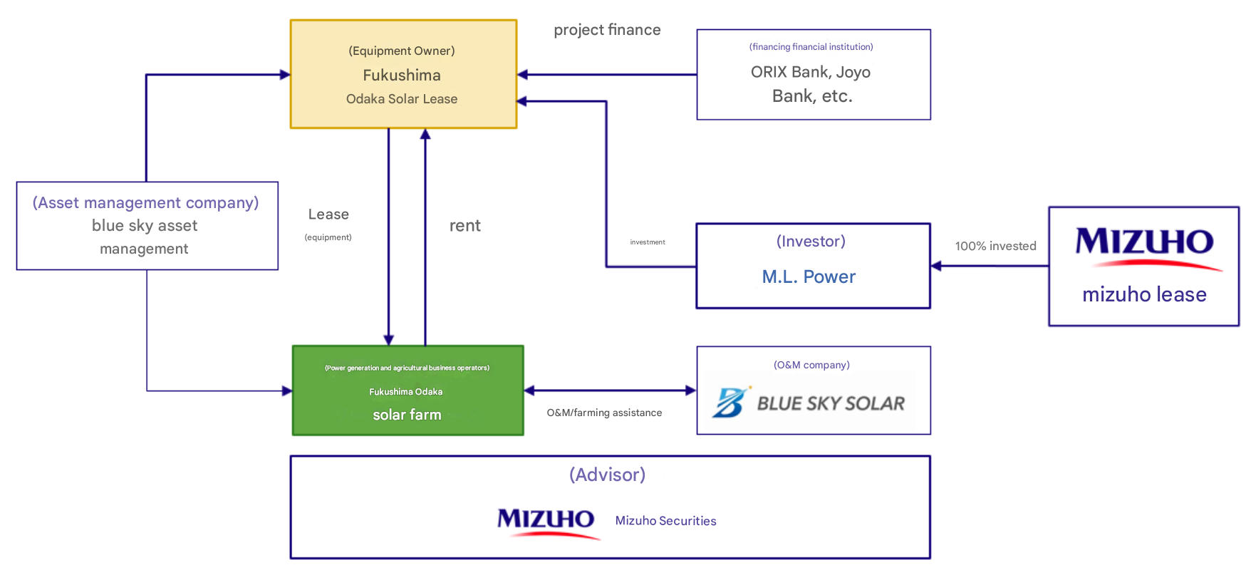 Mizuho Securities, ML Power, a 100% subsidiary of Mizuho Leasing, Blue Sky Solar, and Blue Sky Asset Management have collaborated with lending financial institutions including Orix Bank and Joyo Bank to form a long-term private fund with agri-solar power plants as underlying assets through non-recourse project finance and equity investment.