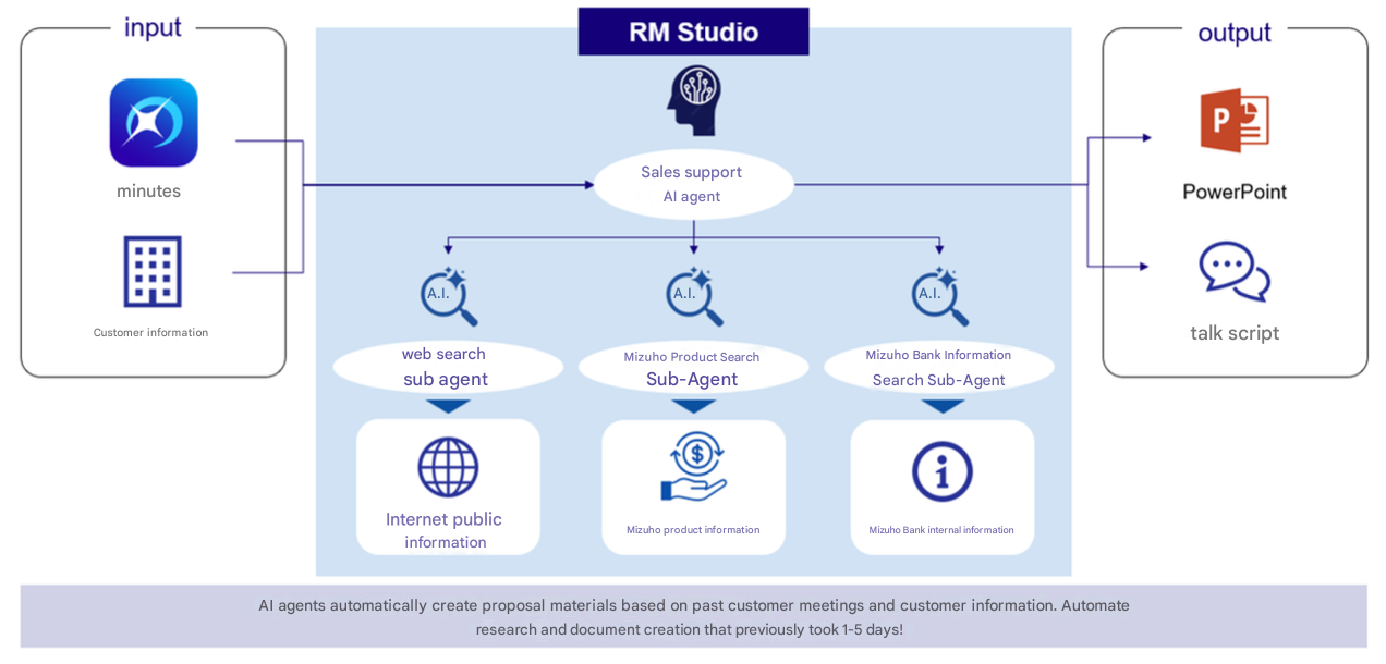 - Mizuho DeepResearch: AI autonomously investigates and summarizes trends in client companies and industries, providing information that contributes to proposal activities.