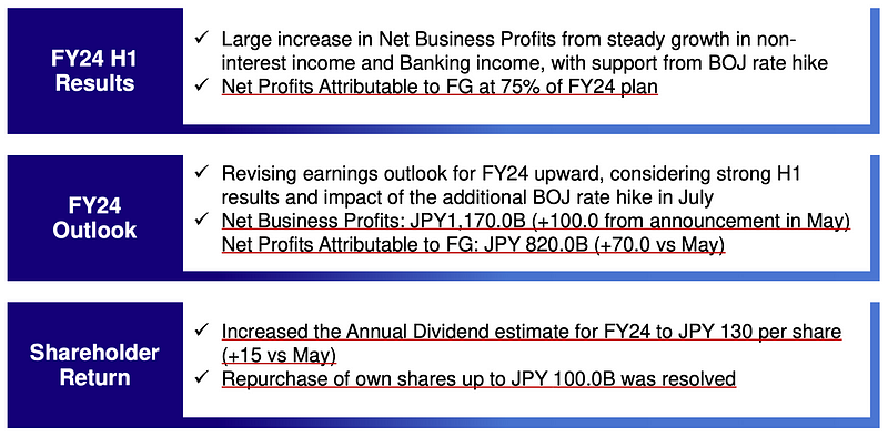 Mizuho Financial Group (MFG) reported robust first-half (H1) FY24 results, exceeding expectations and prompting an upgrade to full-year guidance. The company also announced its first share buyback in 16 years and increased its dividend, signaling confidence in its future performance and a commitment to rewarding shareholders.