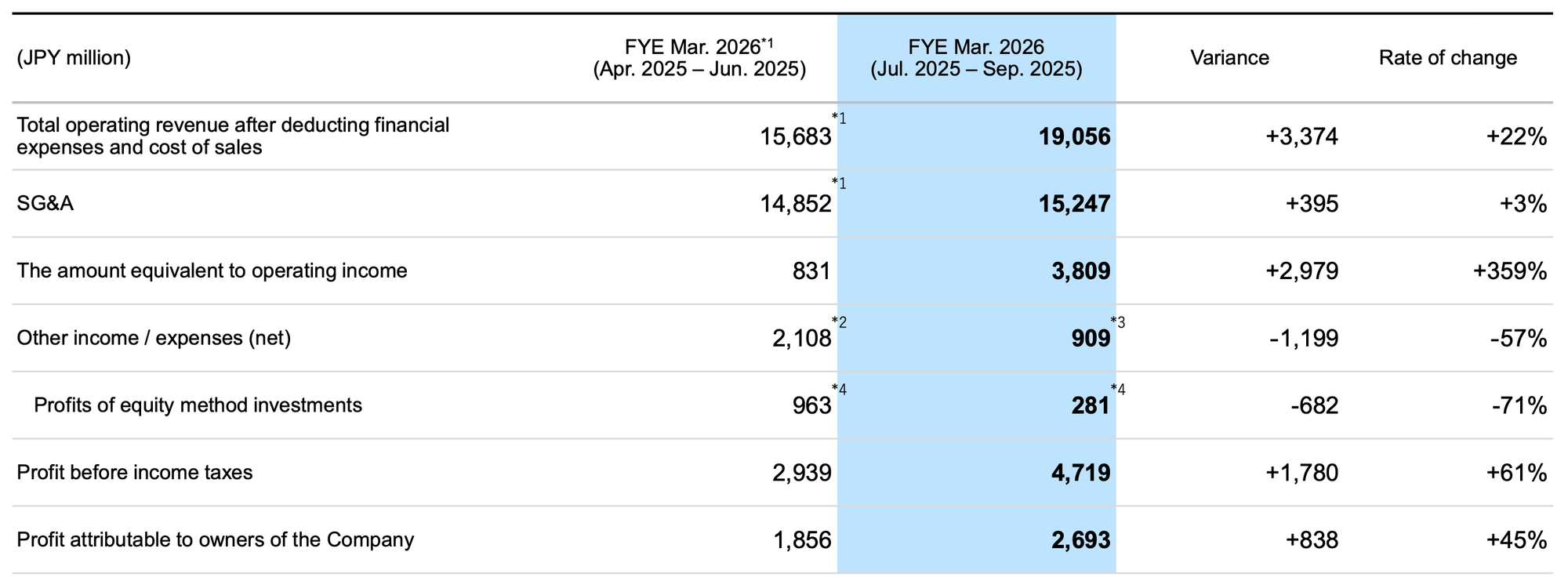 - Quarterly Net Income Attributable to Owners: JPY 2.693 billion, a 45% increase QoQ.