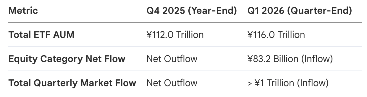 The Japanese ETF market ended a grueling three-quarter streak of net outflows with a commanding recovery. Total net inflows surged past the ¥1 trillion threshold, lifting total assets under management (AUM) to ¥116 trillion—a notable jump from the ¥112 trillion recorded at the end of 2025. This resurgence is a critical indicator of investor sentiment across the broader Asian landscape; rather than retreating from the market soft patch in March, capital allocators demonstrated highly opportunistic behavior, using the ETF vehicle’s liquidity to execute "buy the dip" strategies during localized corrections. Beneath this headline snapback, the market plumbing reveals a sophisticated rotation into yield-sensitive sectors and defensive commodities.