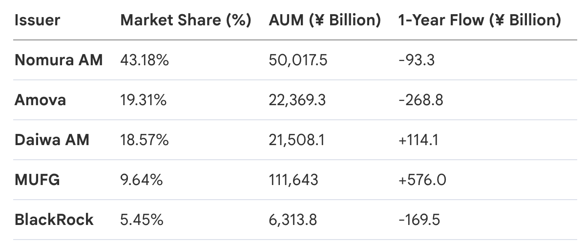 The Japanese ETF landscape remains a fortress of concentration, with the top five issuers commanding the lion's share of the ¥116 trillion market. Nomura Asset Management maintains its heavy-weight status with a 43.18% share, though it continues to see a moderate annual attrition in flows. In contrast, specialized entrants like Global X Japan and Simplex are showing significant momentum. Simplex, in particular, successfully reversed its trajectory, moving from a net outflow in Q1 2025 to a ¥43.6 billion inflow this quarter, illustrating the growing demand for niche, high-conviction strategies.