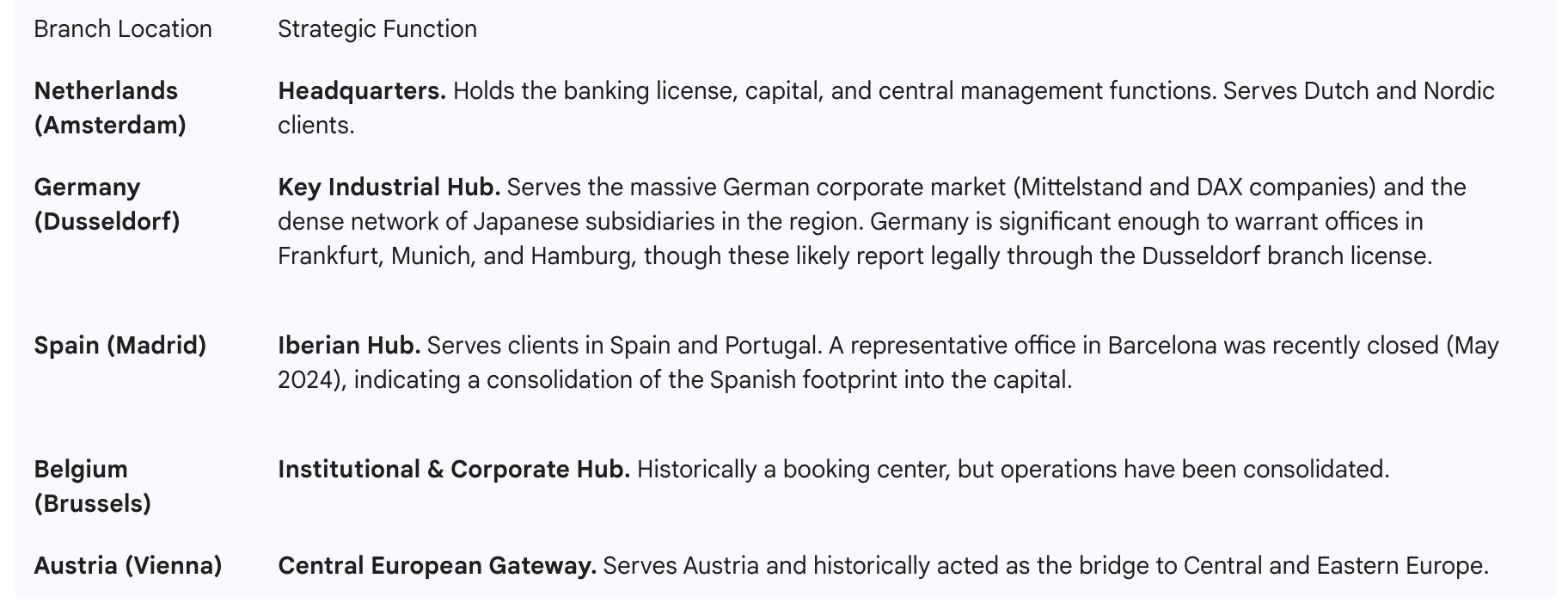 The bank’s passported branch network is strategically concentrated in Western Europe’s core economies: