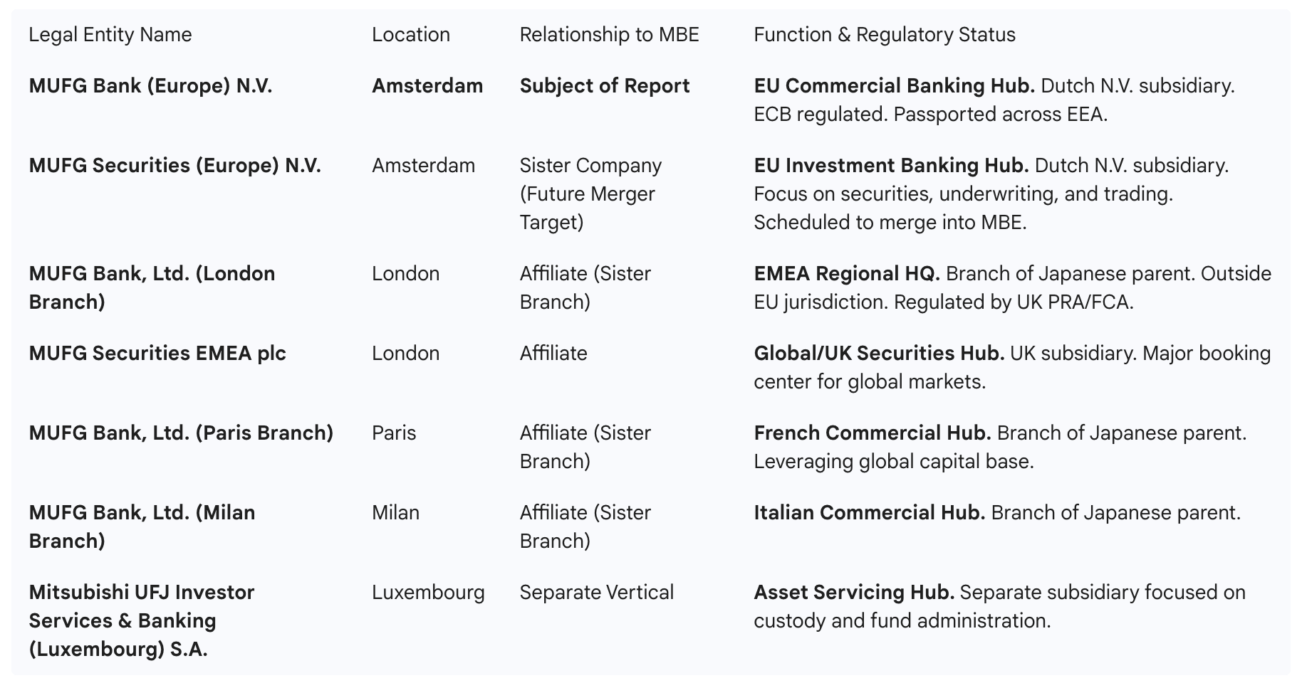 The most forward-looking aspect of MBE’s structure is its designated role in MUFG’s "Universal Bank" strategy. Currently, MUFG operates a bifurcated model in the EU: