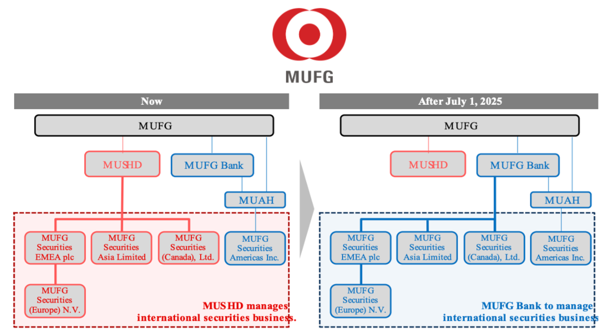 However, in a move to create a more integrated "Global Corporate & Investment Banking" (GCIB) model, MUFG Bank has acquired 100% of the shares of the overseas securities subsidiaries—including MUFG Securities EMEA plc and MUFG Securities (Europe) N.V.—which were previously owned by MUSHD. This shift transformed the securities entities from "cousins" of the commercial bank into direct "siblings" or subsidiaries of the commercial bank.
