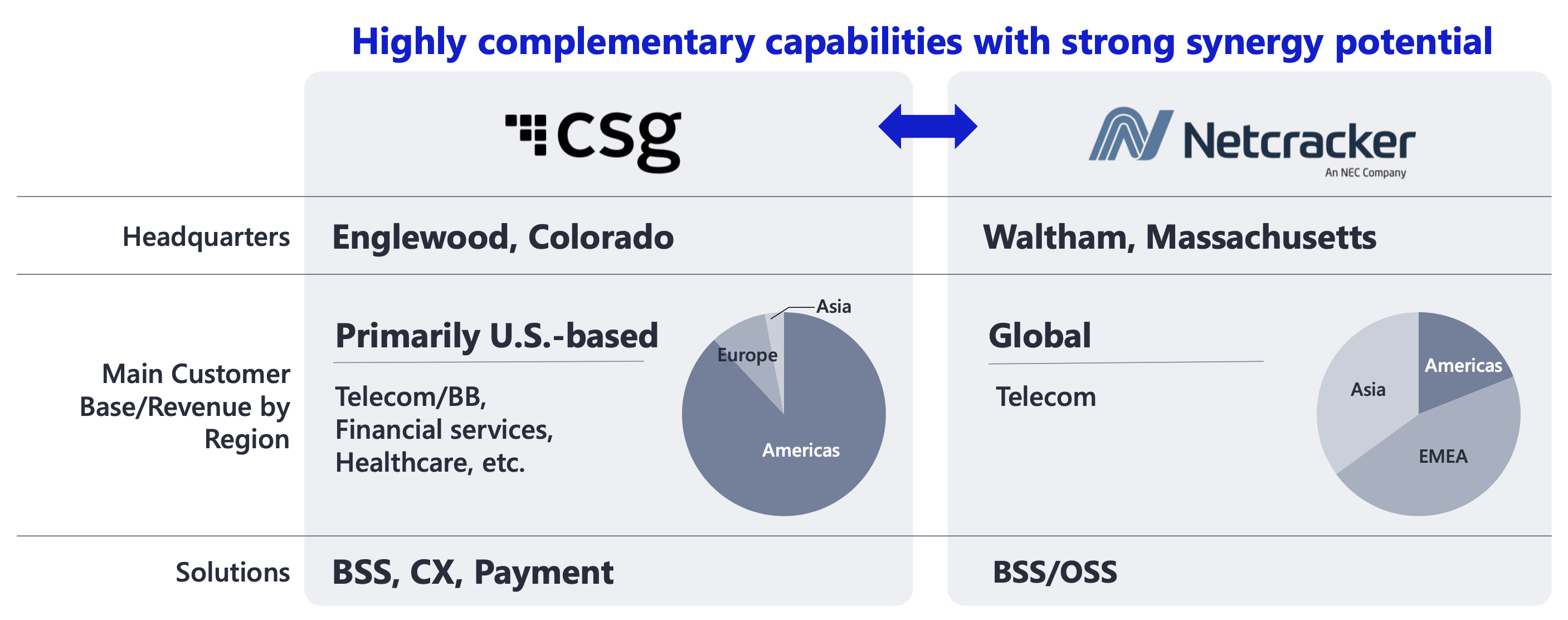 Adding CSG’s proven SaaS product portfolio and strong global customer base to NEC and its subsidiary, Netcracker, delivers meaningful value to customers through a diversified and expanded product portfolio. The transaction will enable NEC to deliver a more competitive offering in next-generation environments, such as global communication service providers, and to leading brands in high-growth sectors such as media, financial services, healthcare, retail and logistics. The transaction builds on the capabilities of NEC’s subsidiary, Netcracker, which provides a complementary global footprint and deep expertise in BSS (Business Support Systems) and OSS (Operational Support Systems), aligning naturally with CSG’s strengths.