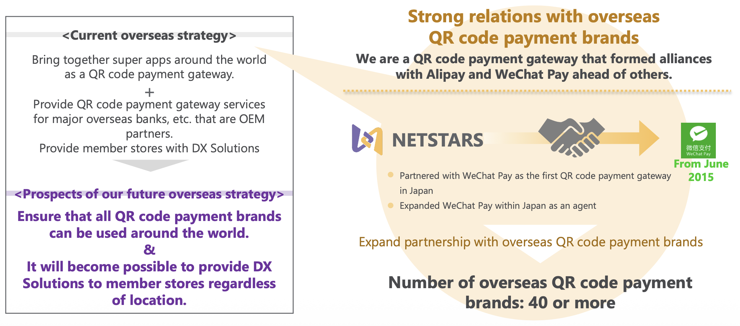 The company plans to continue its aggressive expansion of the "StarPay" network. NetStars currently supports over 40 QR code payment brands—one of the largest portfolios in Japan. The strategy involves not just adding more stores, but expanding into new industries.