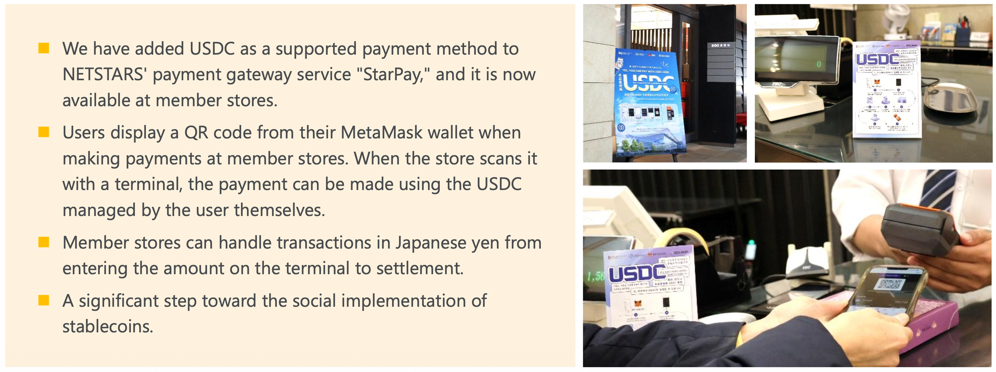 In a Japanese first, NetStars successfully conducted a pilot program at Haneda Airport Terminal 3 accepting USDC (USD Coin) for in-store payments. This system allows users to pay directly from MetaMask wallets, with the merchant receiving Japanese Yen. This bridges the gap between Web3 assets and real-world retail without requiring merchants to handle cryptocurrency directly.