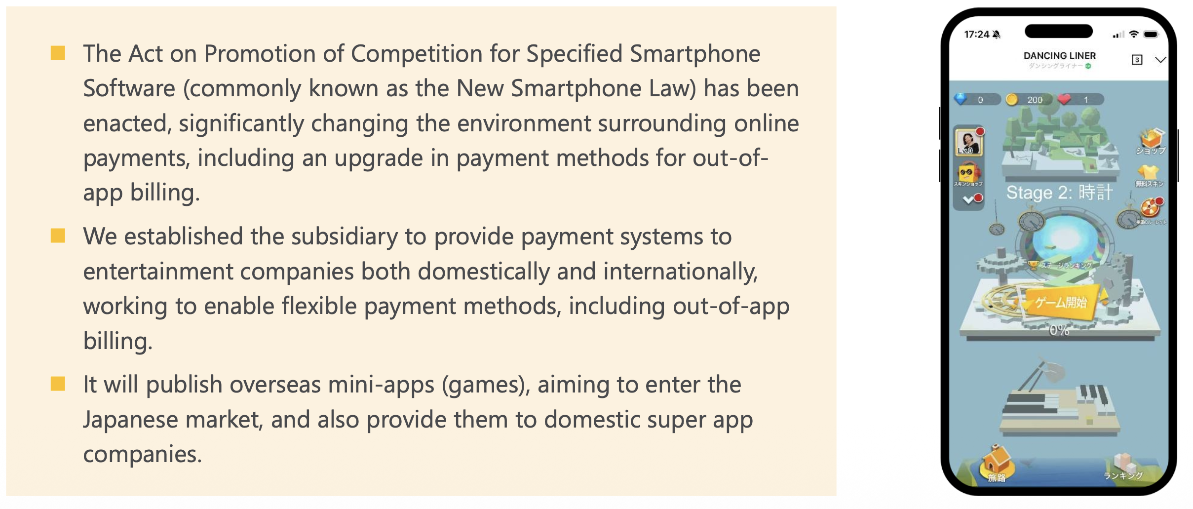 Responding to the "New Smartphone Law" (Act on Promotion of Competition for Specified Smartphone Software), NetStars established a subsidiary to handle out-of-app billing for smartphone games. This service allows game publishers to bypass traditional app store payment rails (and their high fees), offering a direct payment system for users. This represents a significant new revenue stream potential in the high-volume gaming market.