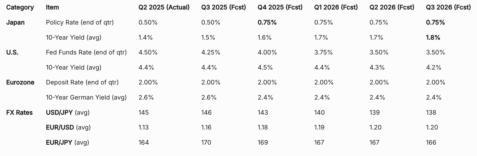 - BOJ Policy Rate: A hike to 0.75% is forecast for late 2025, with a further hike to 1.0% in the second half of 2026. This is contingent on confirmation that wage growth is feeding into service prices and the economy can withstand potential headwinds like US tariffs.