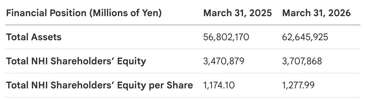 With the conclusion of its 100th-anniversary commemorative dividends in 2025, Nomura has recalibrated its payout structure. For FY2026, the firm declared an annual dividend of 51 yen (27 yen for the first half and 24 yen for the second). While this is down from the 57 yen paid in FY2025, that prior figure included a 10-yen commemorative one-off. Excluding that special payment, the ordinary dividend remains consistent with the firm’s policy of balancing growth reinvestment with shareholder yield.