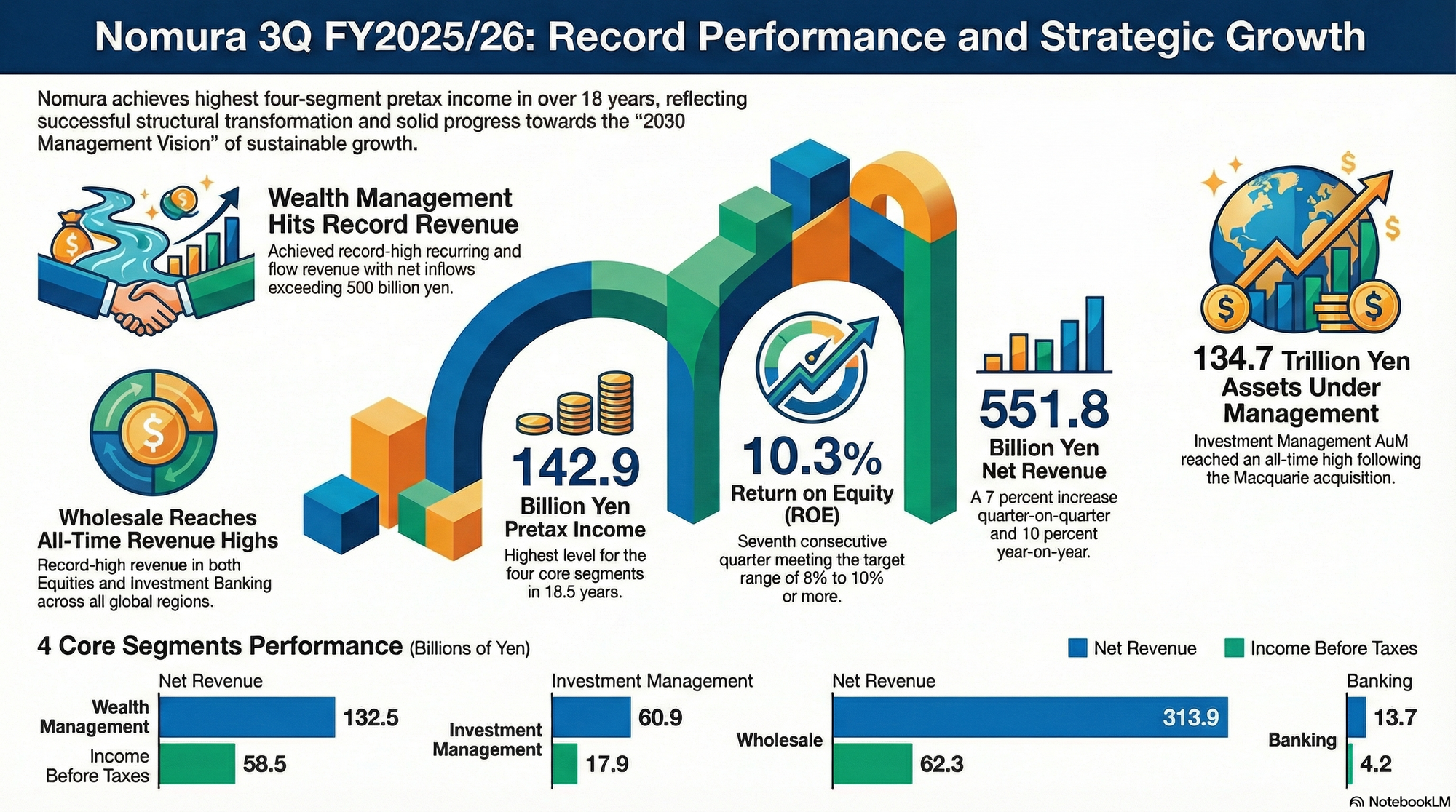Nomura Holdings’ third-quarter results for the fiscal year ending March 31, 2026, provide a clear validation of the firm’s "2030 Management Vision." Achieving a Return on Equity (ROE) of 10.3%, the group has now successfully met its 8%–10% target range for the seventh consecutive quarter. The defining metric of this period is the record-breaking pretax income from the four core business segments, which reached Y142.9 billion—the highest level in eighteen and a half years. This performance signals a decisive pivot away from historical reliance on volatile market swings toward a diversified, resilient earnings model.