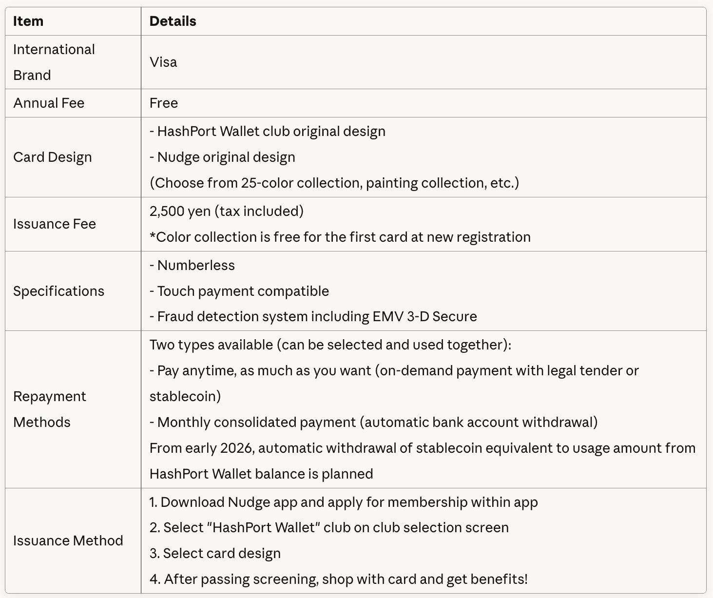 When you join the "HashPort Wallet" club through the Nudge Card app and use this card, 0.3% of your cumulative usage amount will be cashback as "JPYC" to your HashPort Wallet.