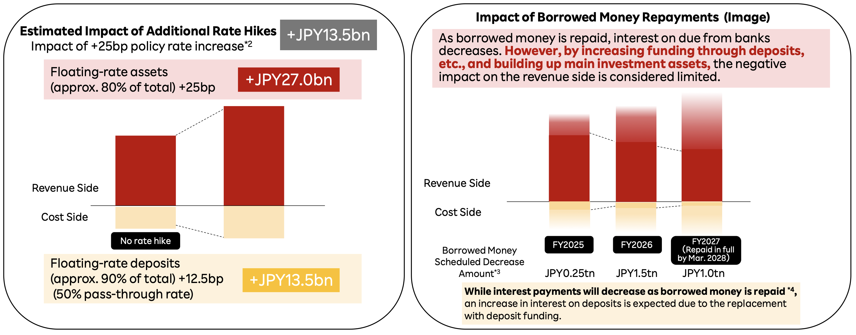 - Interest Rate Sensitivity: The bank disclosed its interest rate sensitivity for the first time, simulating that a +25 basis point increase in the policy rate would generate an additional JPY 13.5 billion in Net Interest Income annually. This assumes a 50% pass-through rate (deposit beta) to floating-rate deposits.
