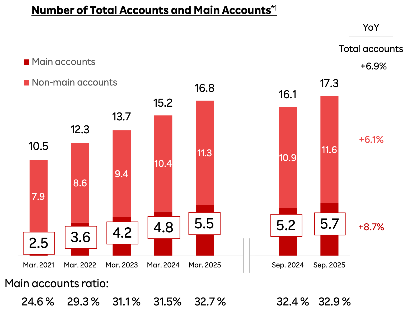 - Main Account Growth: The number of main accounts, which are more profitable and have higher balances, grew by 8.7% YoY, outpacing the 6.9% growth in total accounts.