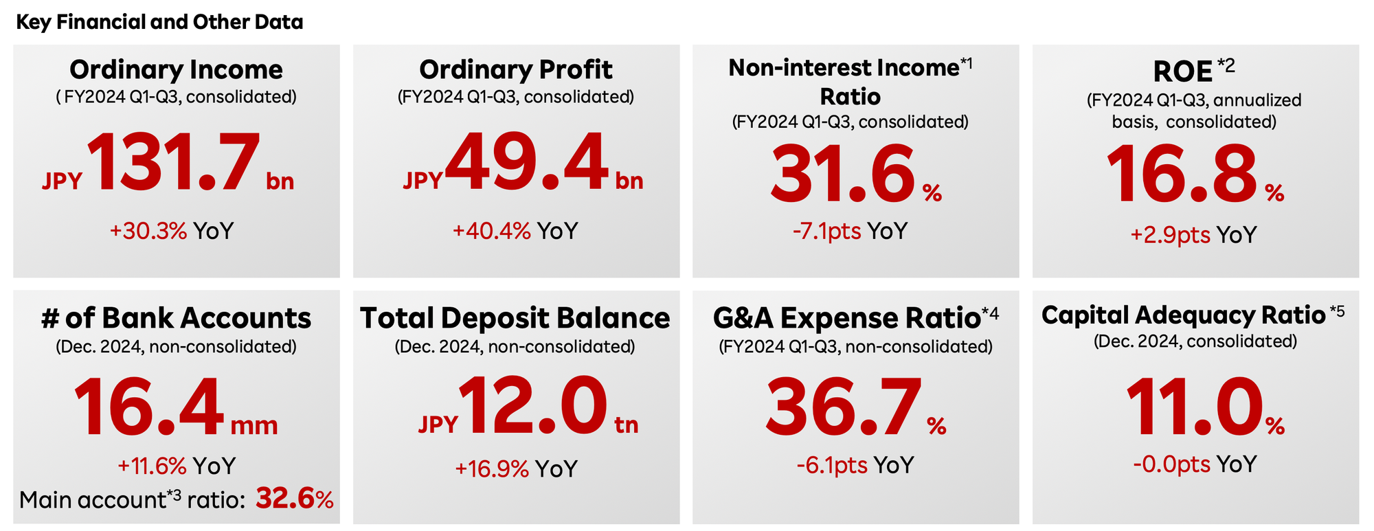 Ordinary income for the first three quarters of FY2024 reached JPY 131.7 billion, a 30.3% increase year-over-year. Ordinary profit saw an even more substantial rise, growing by 40.4% to JPY 49.4 billion. Profit attributable to owners of the parent also surged by 40.2% to JPY 35.1 billion. These figures not only highlight the bank's strong financial performance but also exceeded the growth rate of the earnings forecast that was revised upward in November 2024.