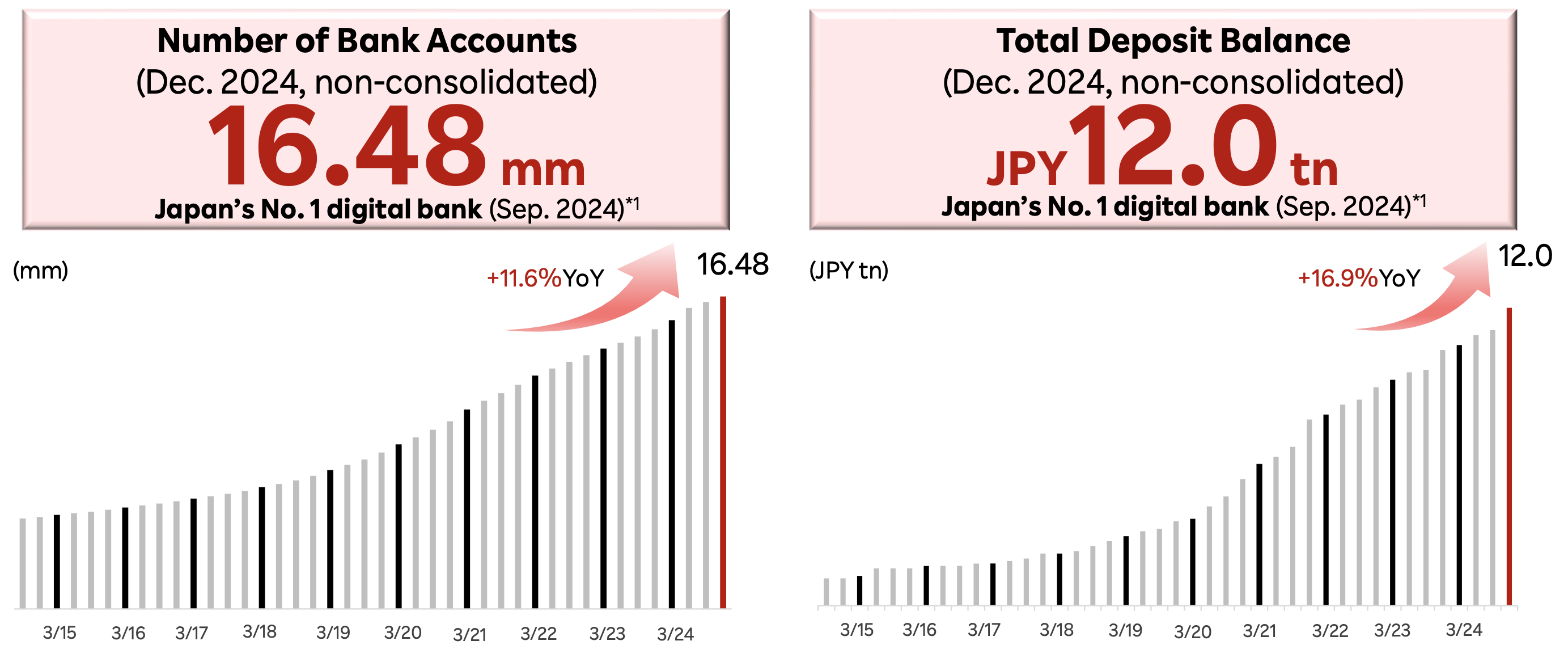 Total deposit balance experienced robust growth as well, reaching JPY 12.0 trillion, a 16.9% increase year-over-year, and also ranking Rakuten Bank as the No. 1 digital bank in Japan by deposit balance. This growth outpaced the increase in the number of accounts, signifying higher deposit balances per account, particularly among main account holders. The bank celebrated a significant milestone, surpassing JPY 12 trillion in deposits within just five months of reaching JPY 11 trillion.