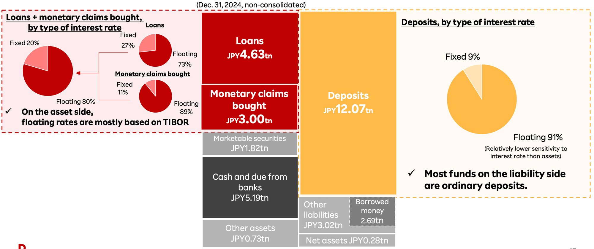 Rakuten Bank's balance sheet reflects its investment strategy and risk profile. Approximately 80% of the bank's investment assets adopt floating rates, primarily linked to TIBOR (Tokyo Interbank Offered Rate). This makes the bank's interest income sensitive to changes in short-term interest rates. The due from the Bank of Japan is also linked to changes in policy rates. On the liability side, 91% of deposits are floating rate, although their sensitivity to interest rate changes is lower than that of assets. Most of the bank's funding comes from ordinary deposits.
